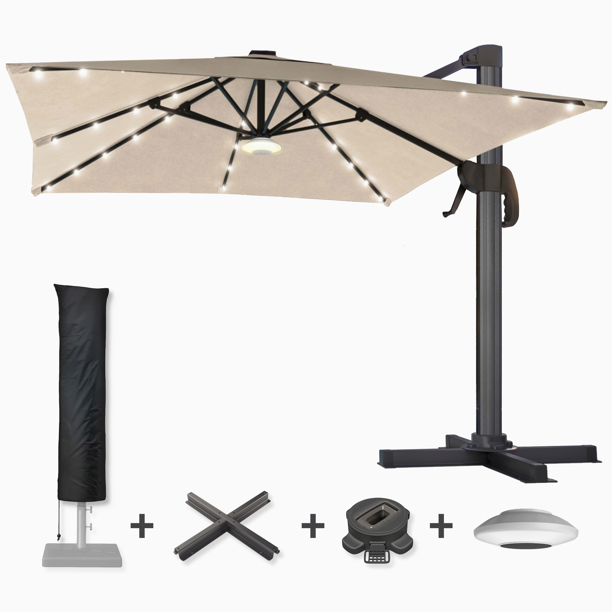 SUN LUIS | Parasol | Square | W:D 300 x 300 cm | Taupe | LED | +stand, swivel base & cover