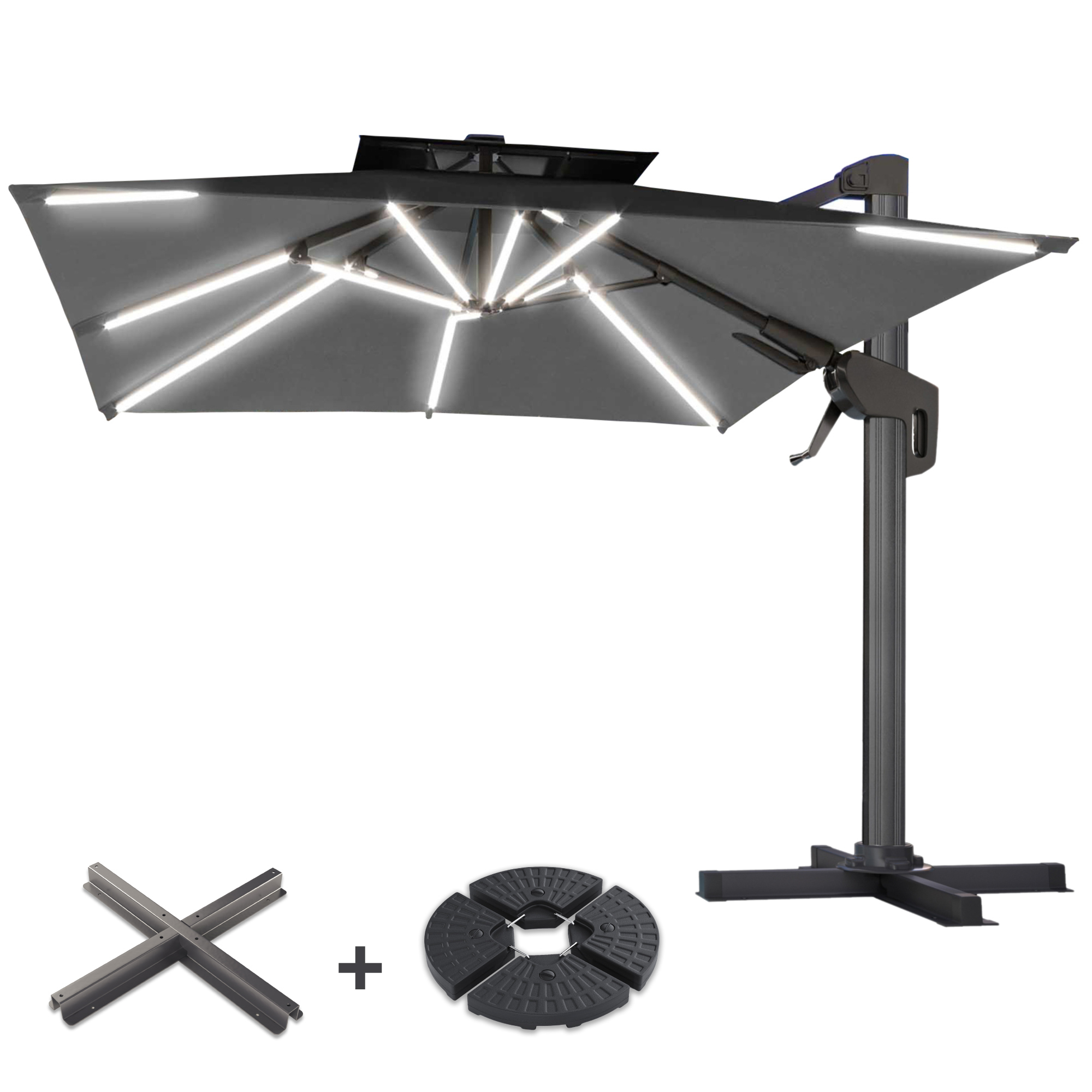 SUN PIETRO | Parasol | Square | B:T 300 x 300 cm | Black | LED | +Stand