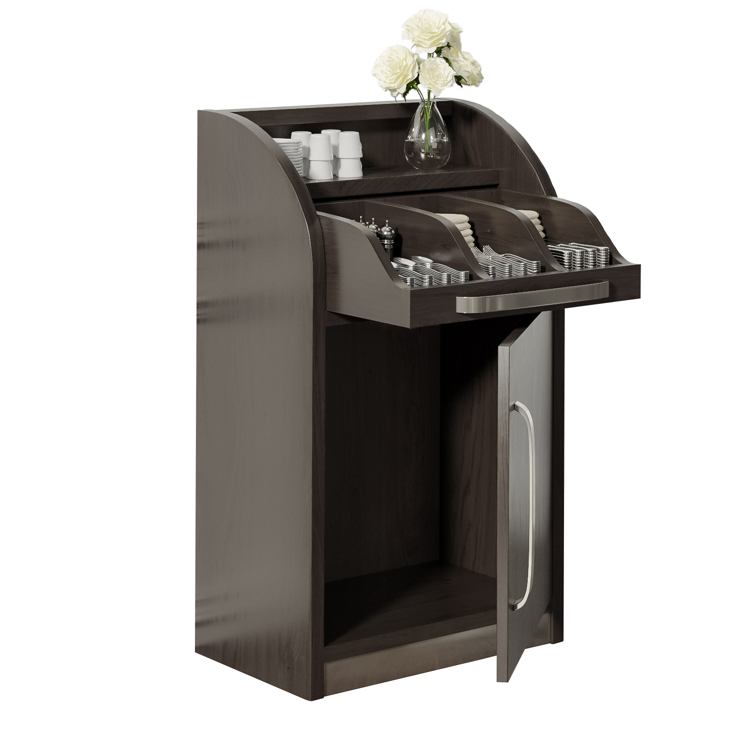 - Säilytystila: Mitä lähempänä tarjoilija on toimintaa, sitä nopeammin asiakkaan toiveet voidaan täyttää! Siksi ruokailuvälinekaappi voidaan myös helposti järjestää uudelleen tai sijoittaa vierekkäin, jotta tarjoilu olisi mahdollisimman edullista.