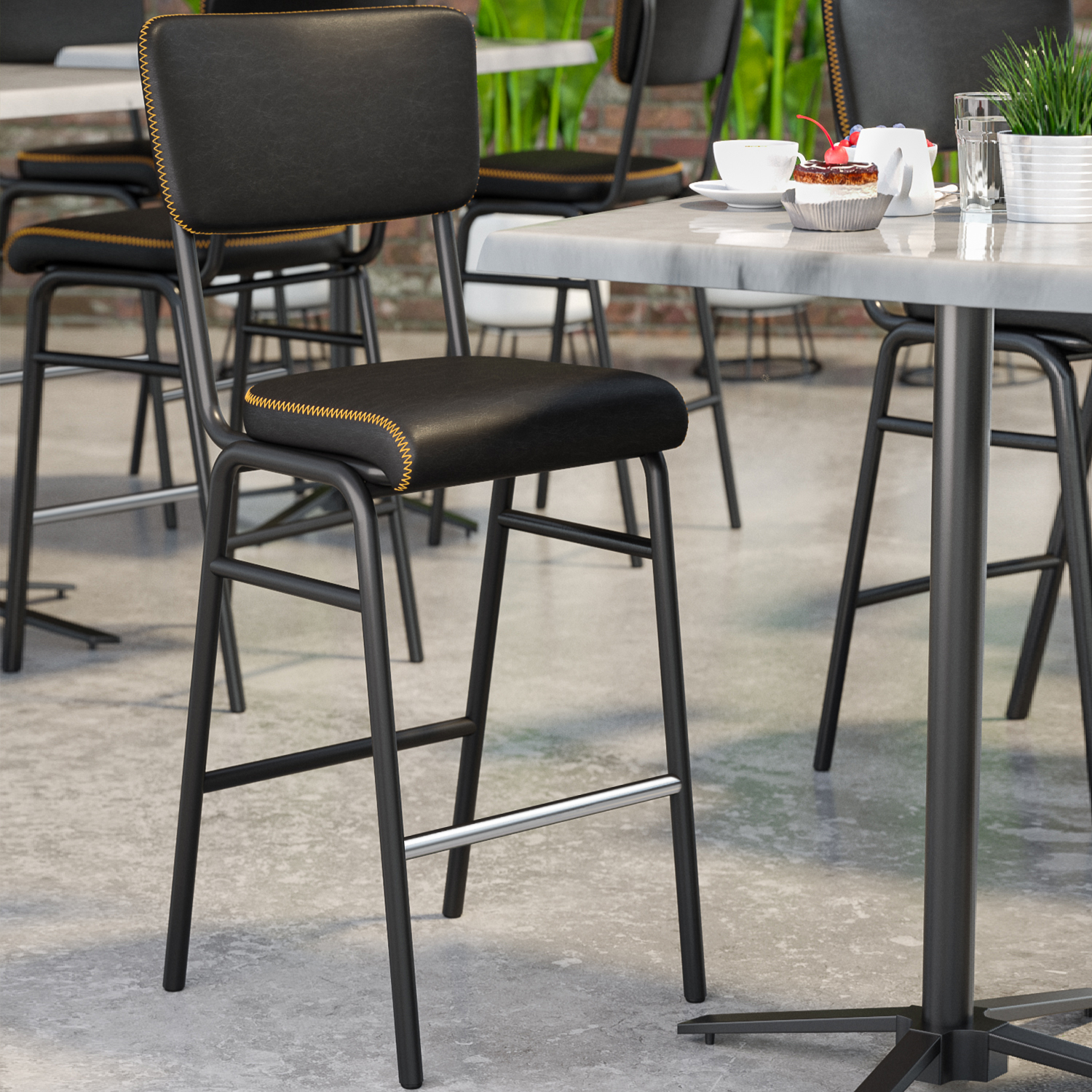 Lena-baarijakkarassamme on kaunis kultainen siksak-tikkaus, joka on istuimen ja selkänojan sivulla. Jalat on valmistettu jauhemaalatusta teräksestä ja niissä on muovinen tuolin jalkakorkki
