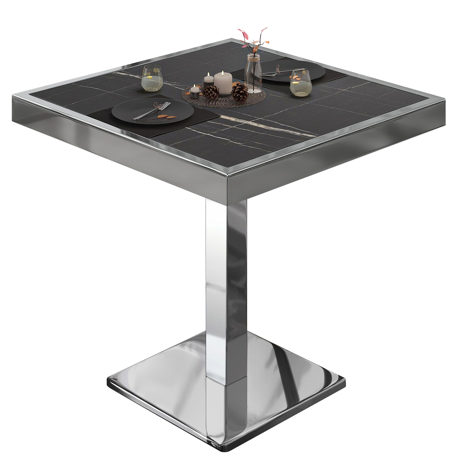 BM | Table de bistrot | L:P:H 60 x 60 x 77 cm | Marbre noir / Acier inoxydable | Carré