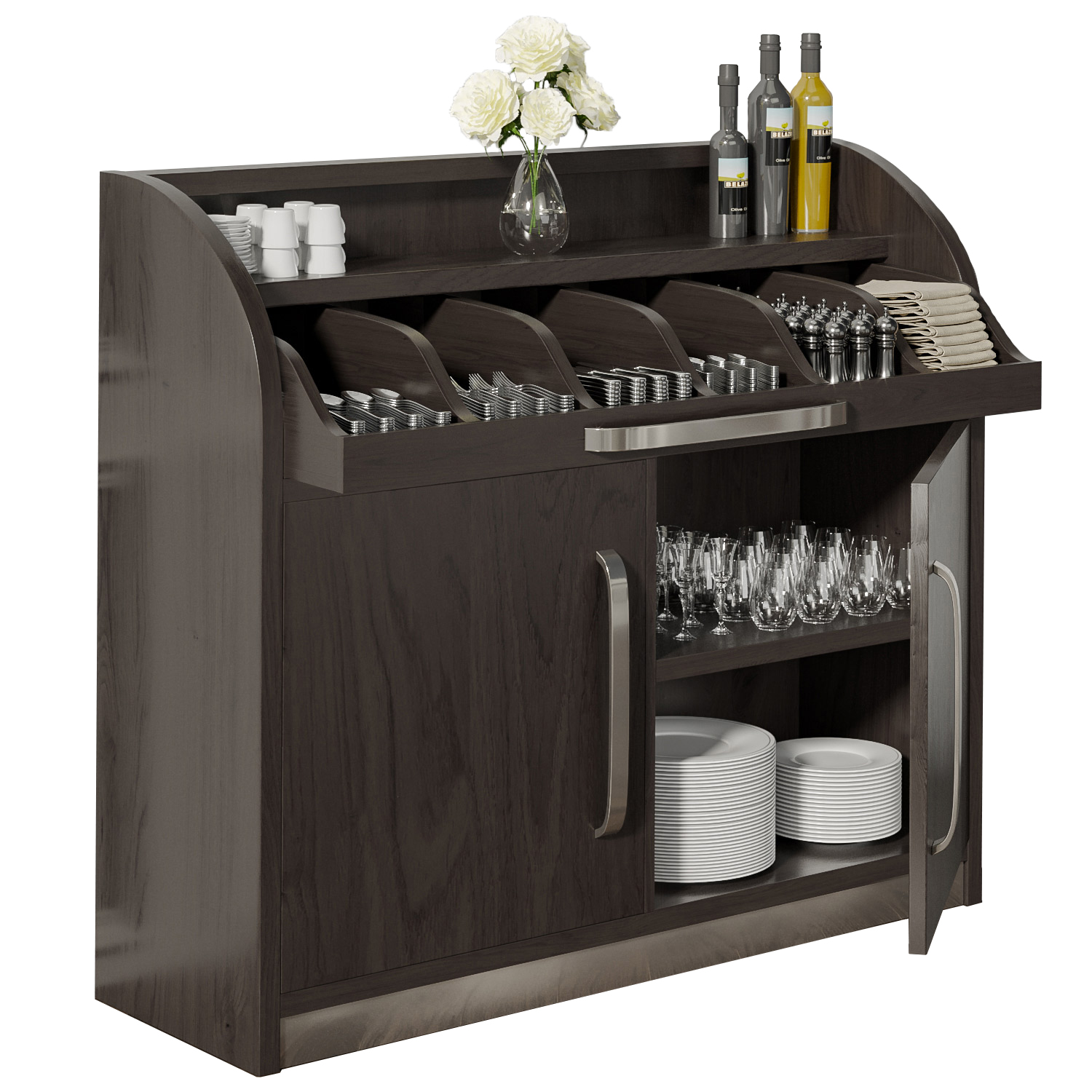 - oppbevaringsplass: Jo nærmere kelneren er handlingen, jo raskere kan kundens ønsker oppfylles! Derfor kan bestikkskapet også enkelt omorganiseres eller enkelt stilles opp for å kunne brukes så effektivt som mulig.