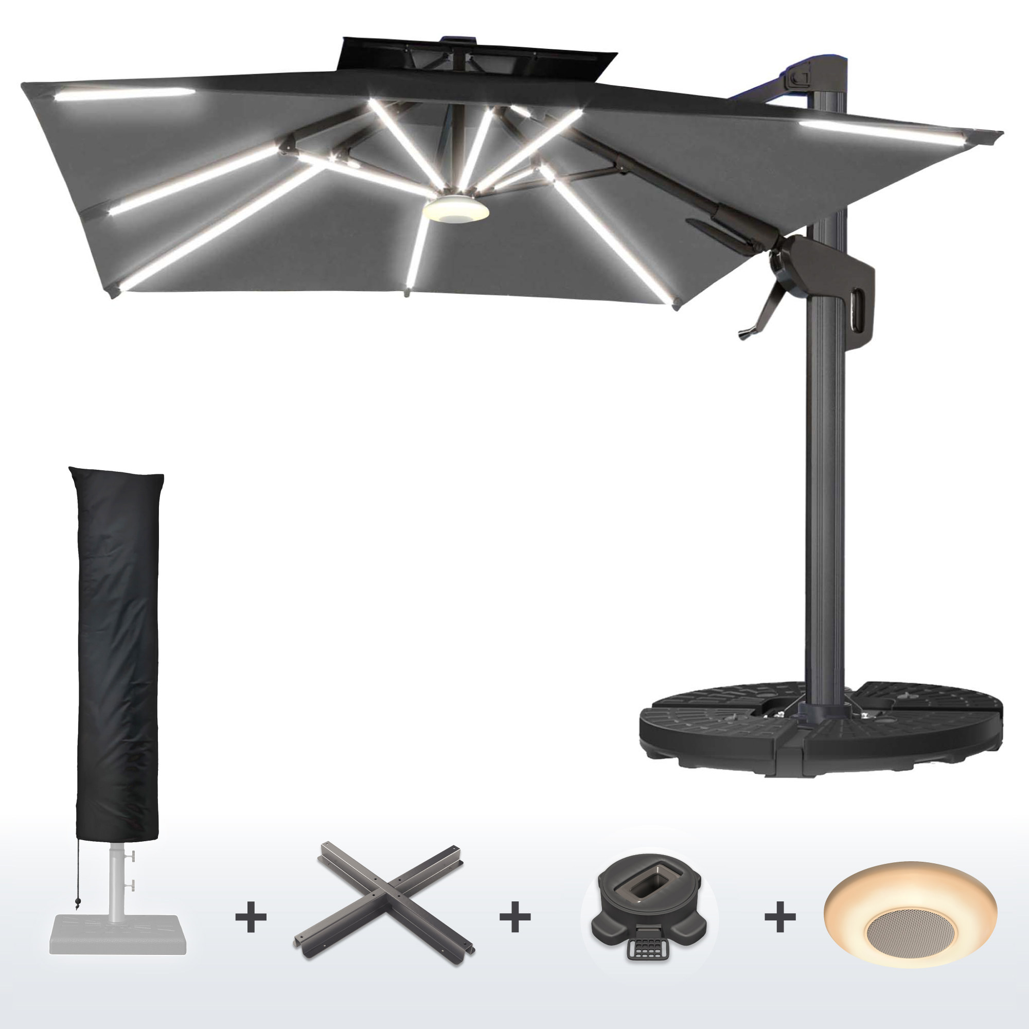 SUN PIETRO | Parasoll | Torget | B: D 300 x 300 cm | Svart | LED | + Stativ, dreibar base og etui