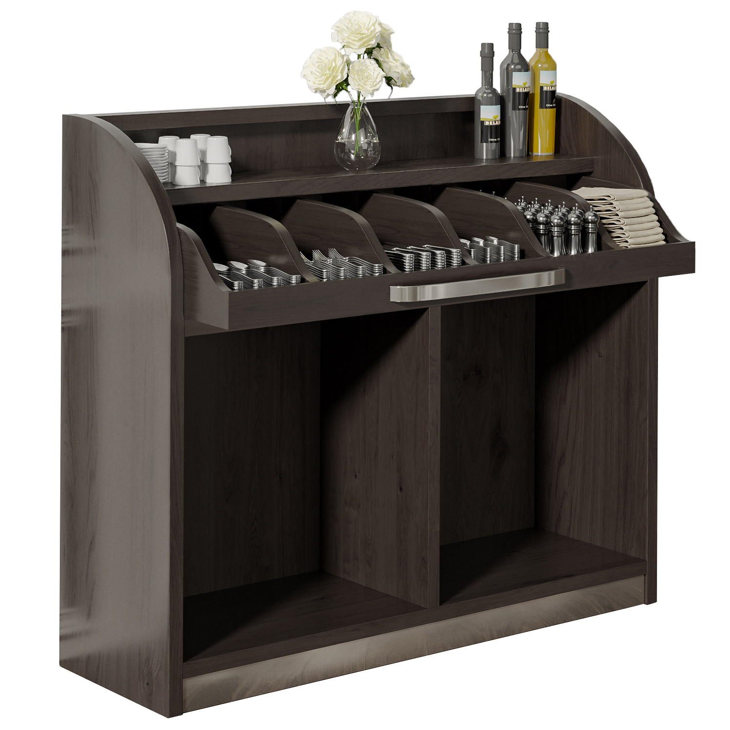 - Opslagruimte: Hoe dichter de ober bij de actie is, hoe sneller de wensen van de klanten kunnen worden vervuld! Daarom kan de bestekkast ook gemakkelijk worden herschikt of in een rij worden gezet om zo voordelig mogelijk te dienen.