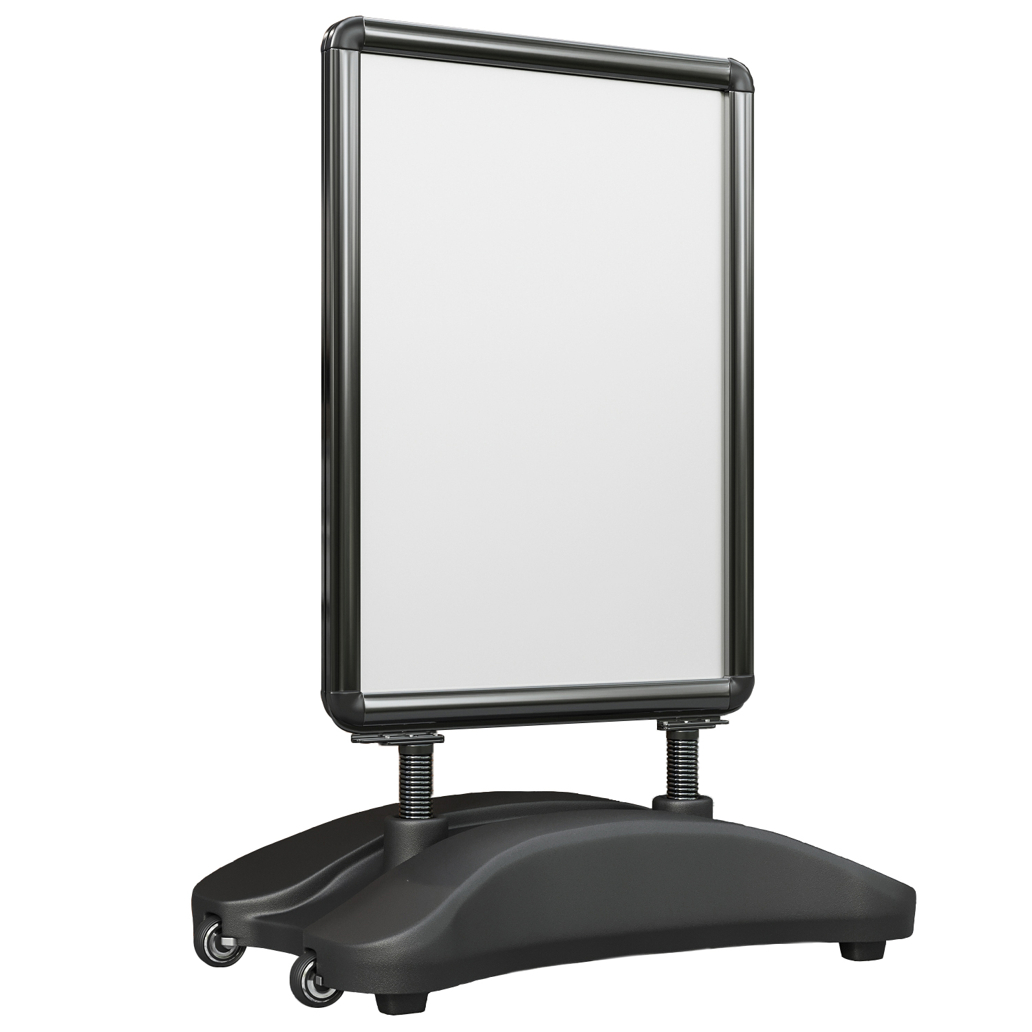 - Andere concurrenten: Veel andere plakatstandaards op de markt zijn vaak minder stabiel en weerbestendig. Dunnere profielen met scherpe hoeken verhogen het risico op verwondingen, terwijl niet-vulbare of kleine voeten snel leiden tot kantelgevaar. Vaak ontbreken robuuste stalen veren, beschermfolies of transportwielen, waardoor posters bij wind en weer beschadigd kunnen raken en het verplaatsen omslachtig is.