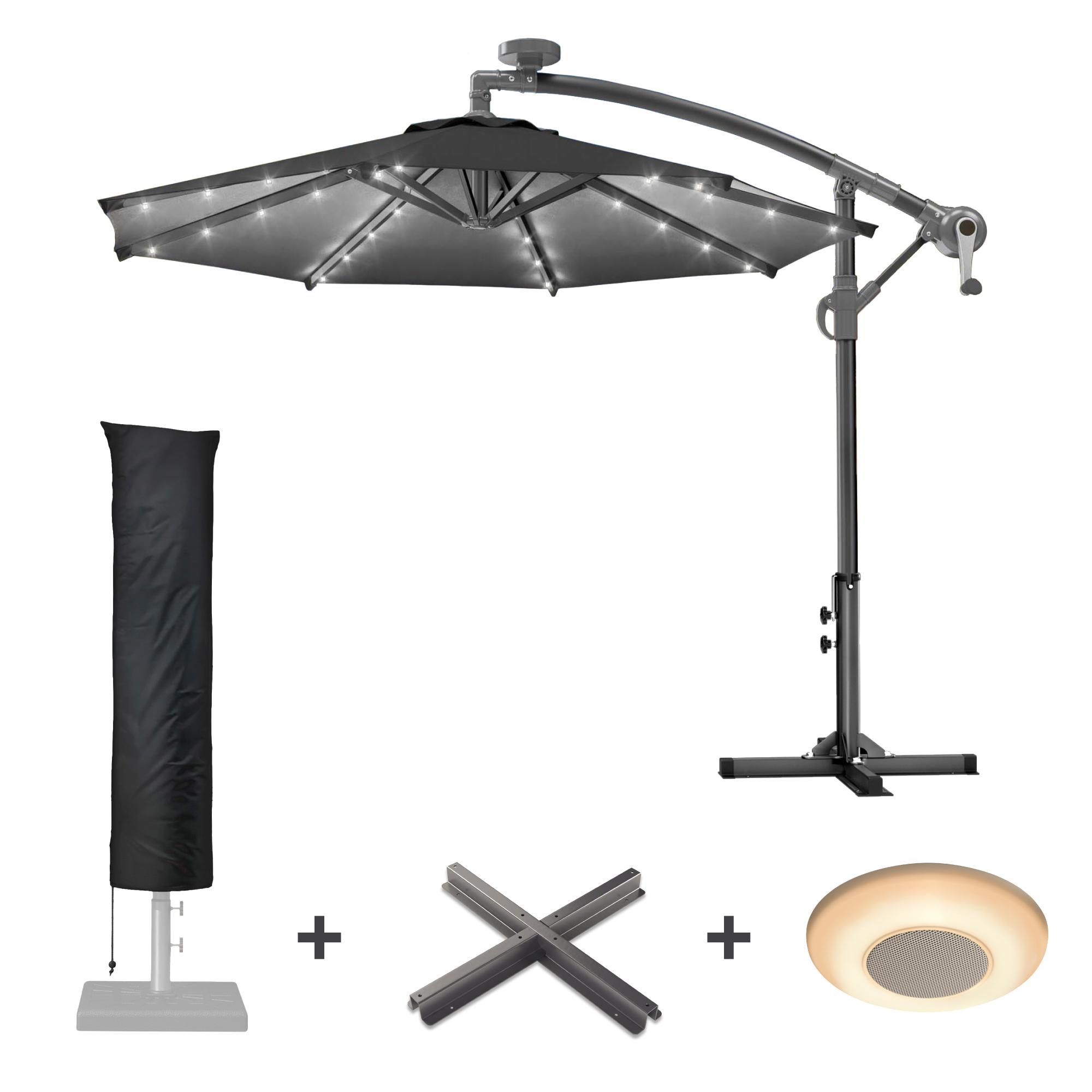 SUNSET | Parasol | Rond | Ø 300 cm | Zwart | LED + standaard & deksel