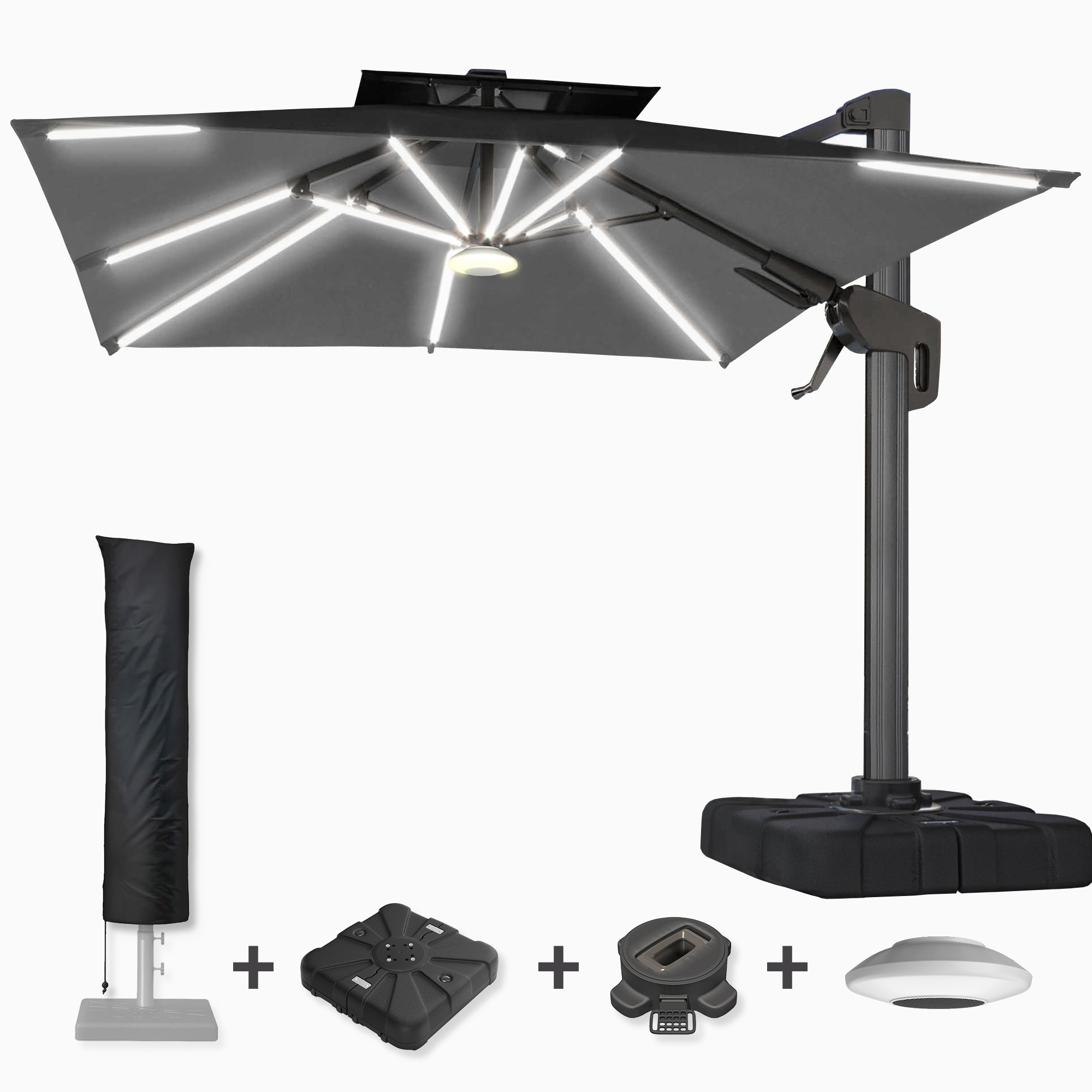 SUN PIETRO | Parasoll | Fyrkant | B:D 300 x 300 cm | Svart | LED | + stativ, vridbar bas & skydd